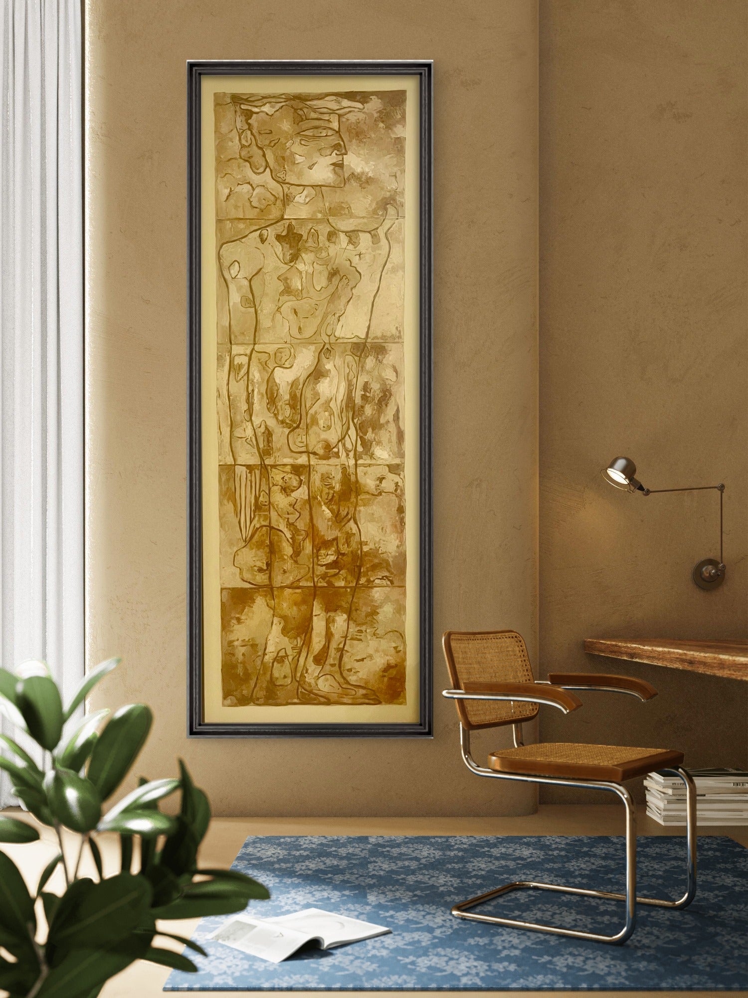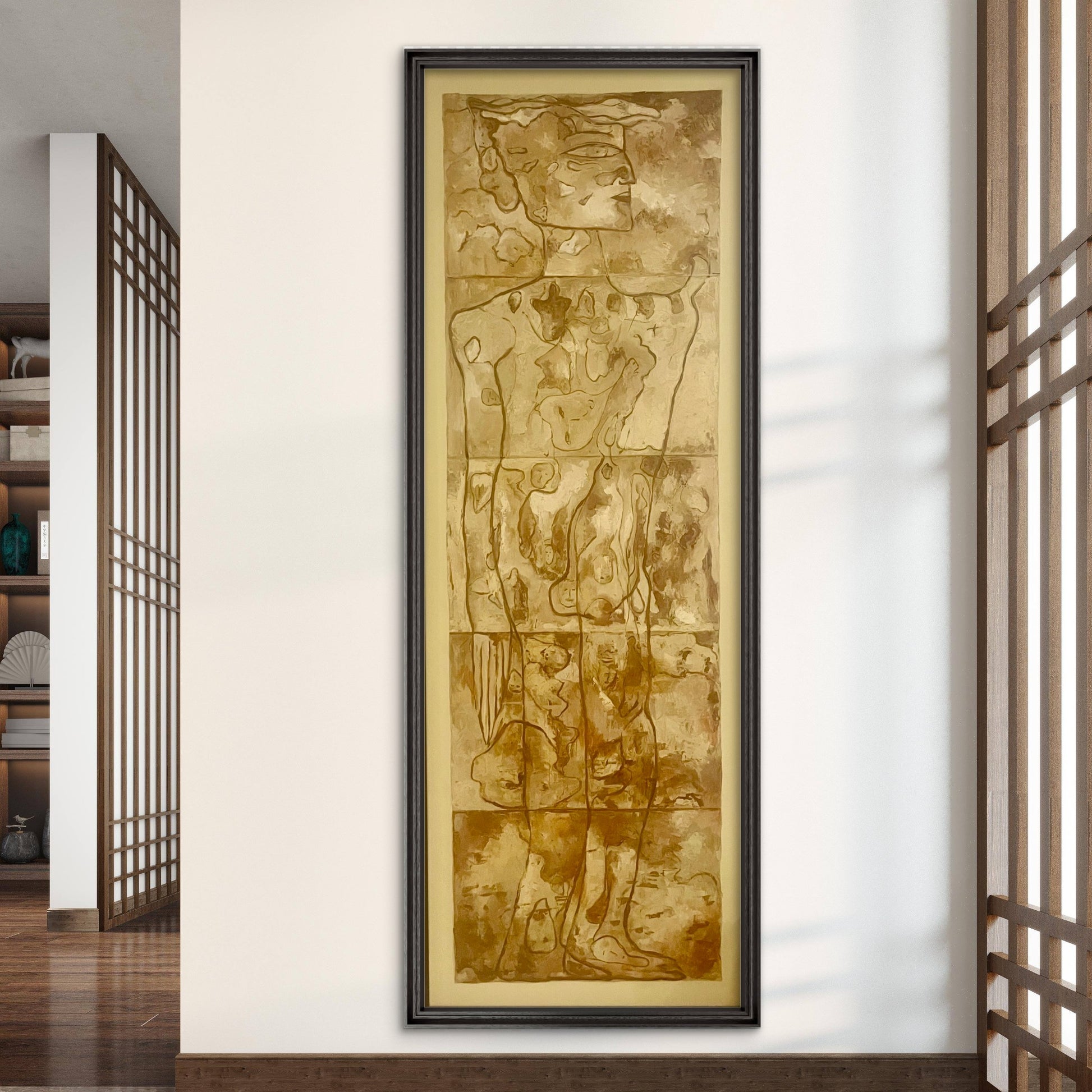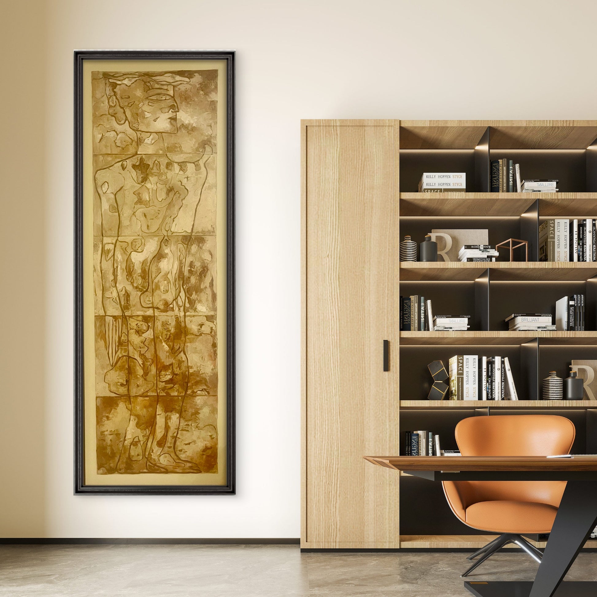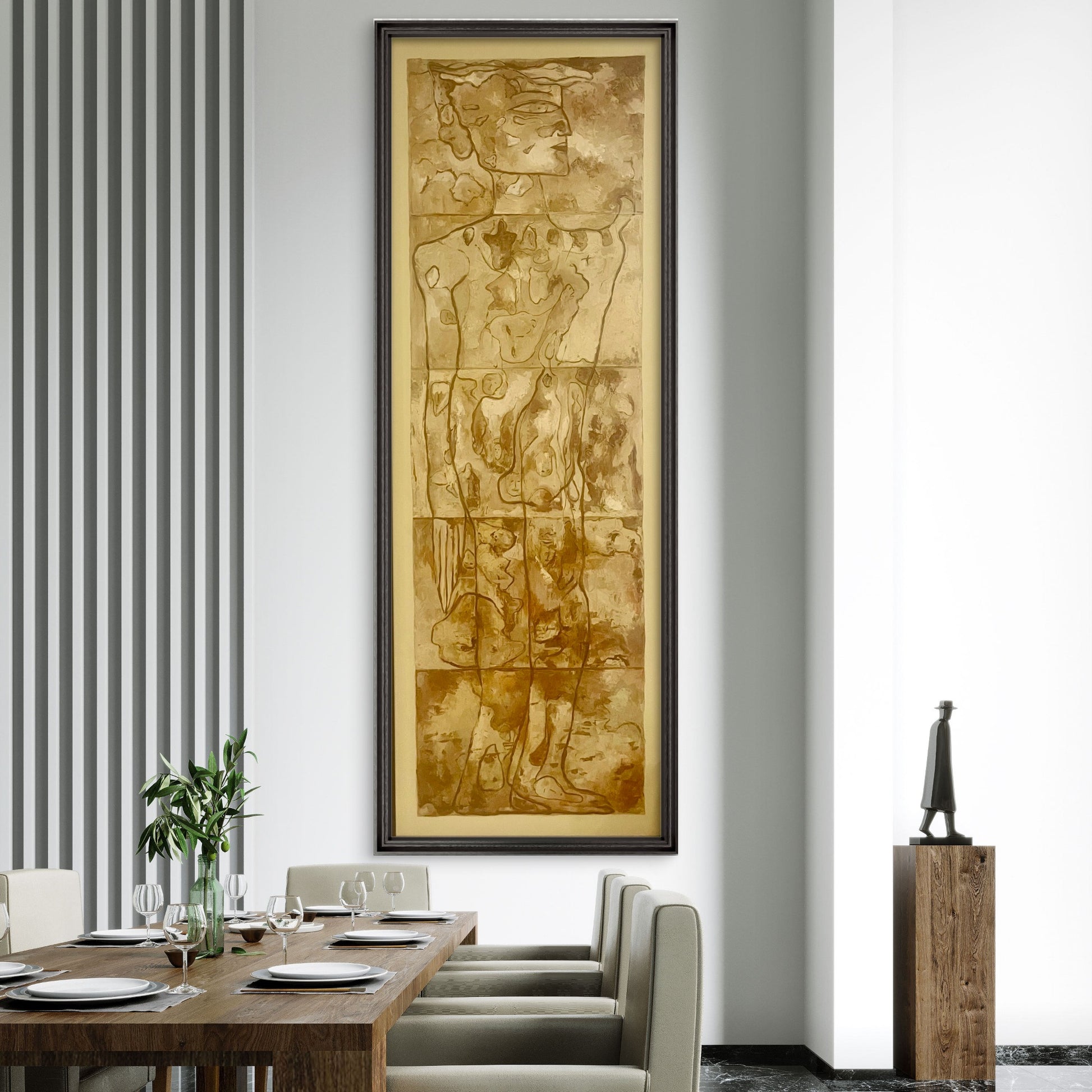This striking two-piece contemporary collection captures the raw spirit of Baja California through bold, abstract composition. Rendered in warm, earthy pigments that echo the peninsula's desert terrain, the paintings feature an elongated figure traversing the landscape alongside surrounding portraits representing the region's rich cultural tapestry. With subtle Egyptian undertones and textured surfaces that command attention, these large-format works function as powerful focal points in expansive interiors. The vertical orientation suits gallery-style presentation, while the sophisticated interplay of indigenous and modern aesthetics introduces both visual depth and meaningful cultural resonance to discerning collectors seeking statement art with narrative substance.