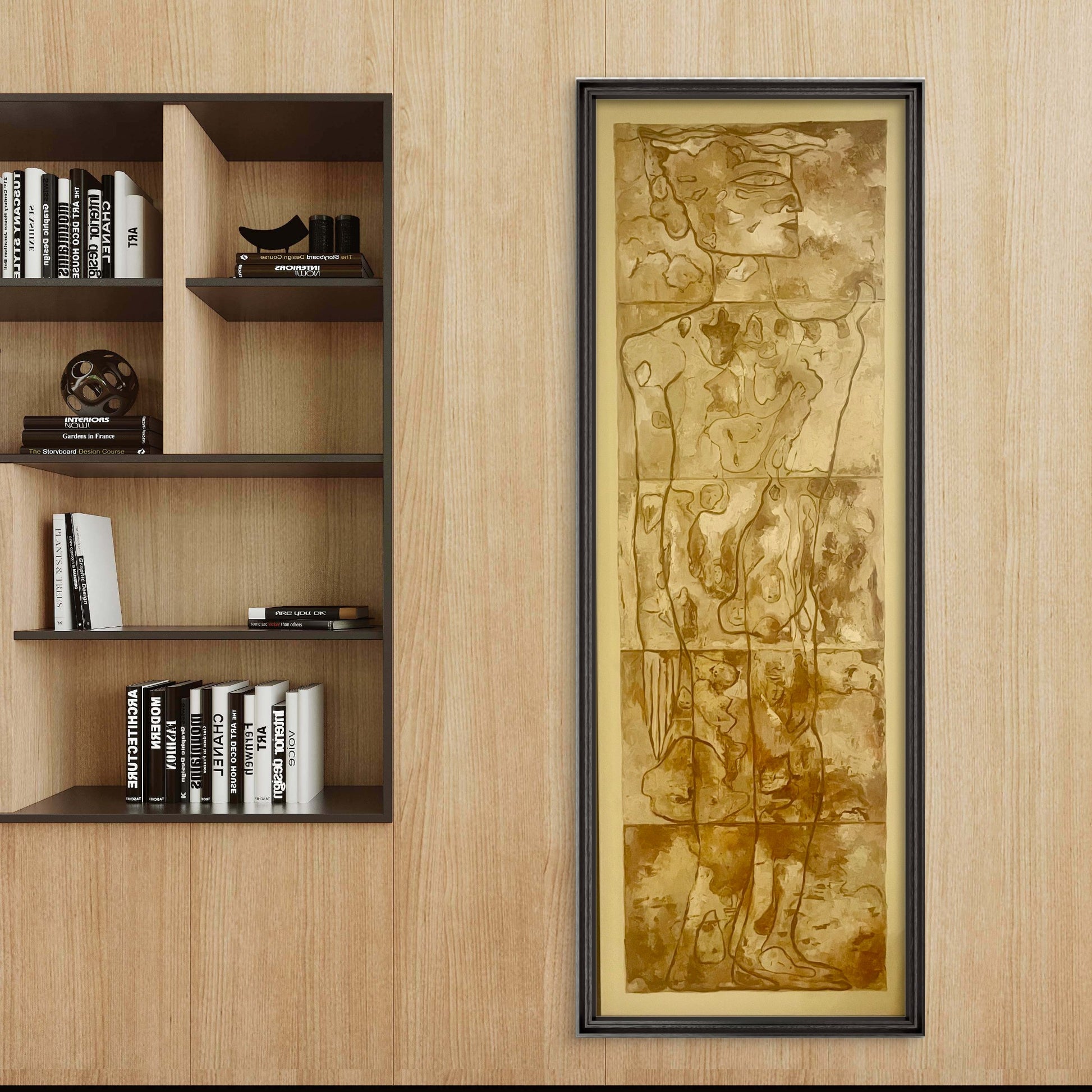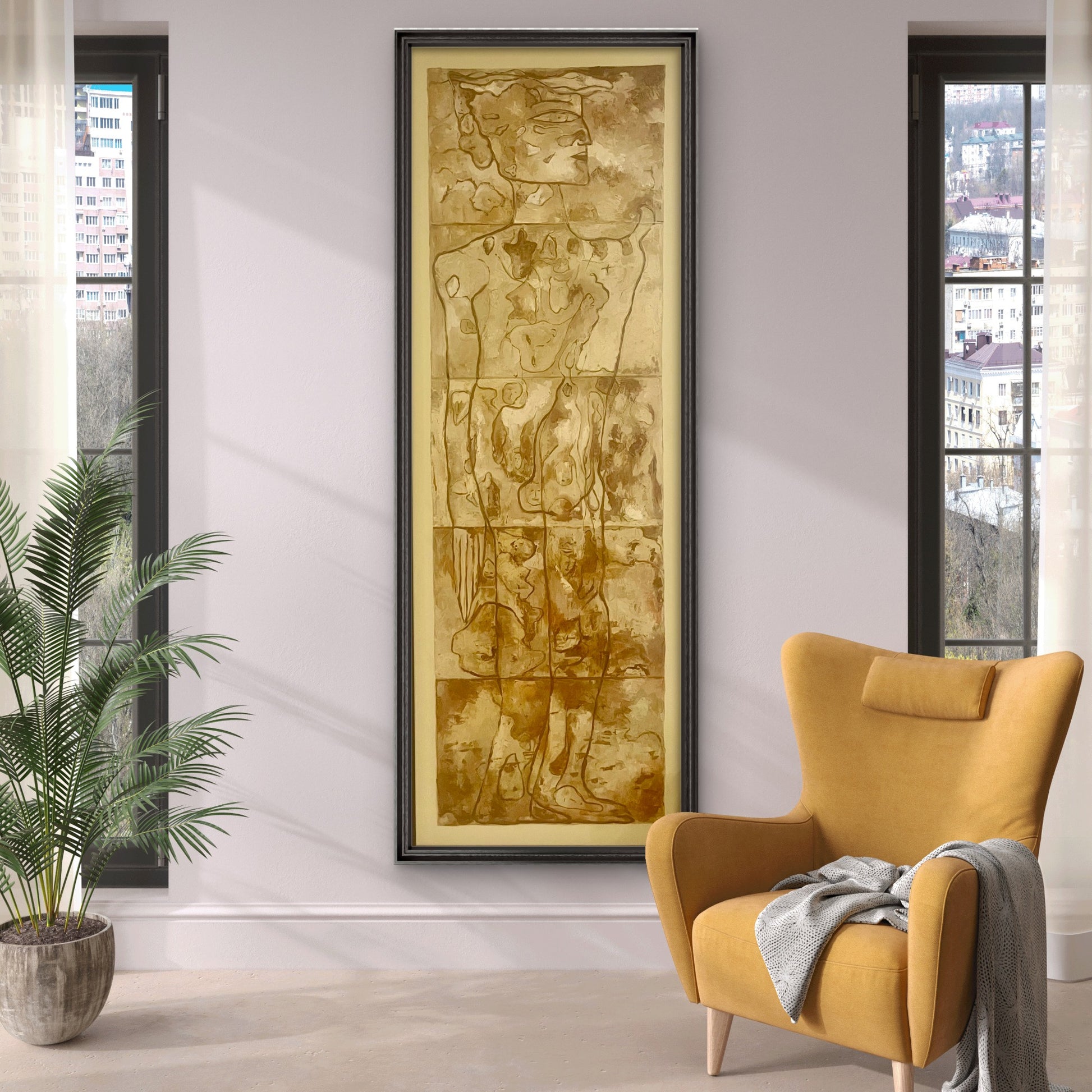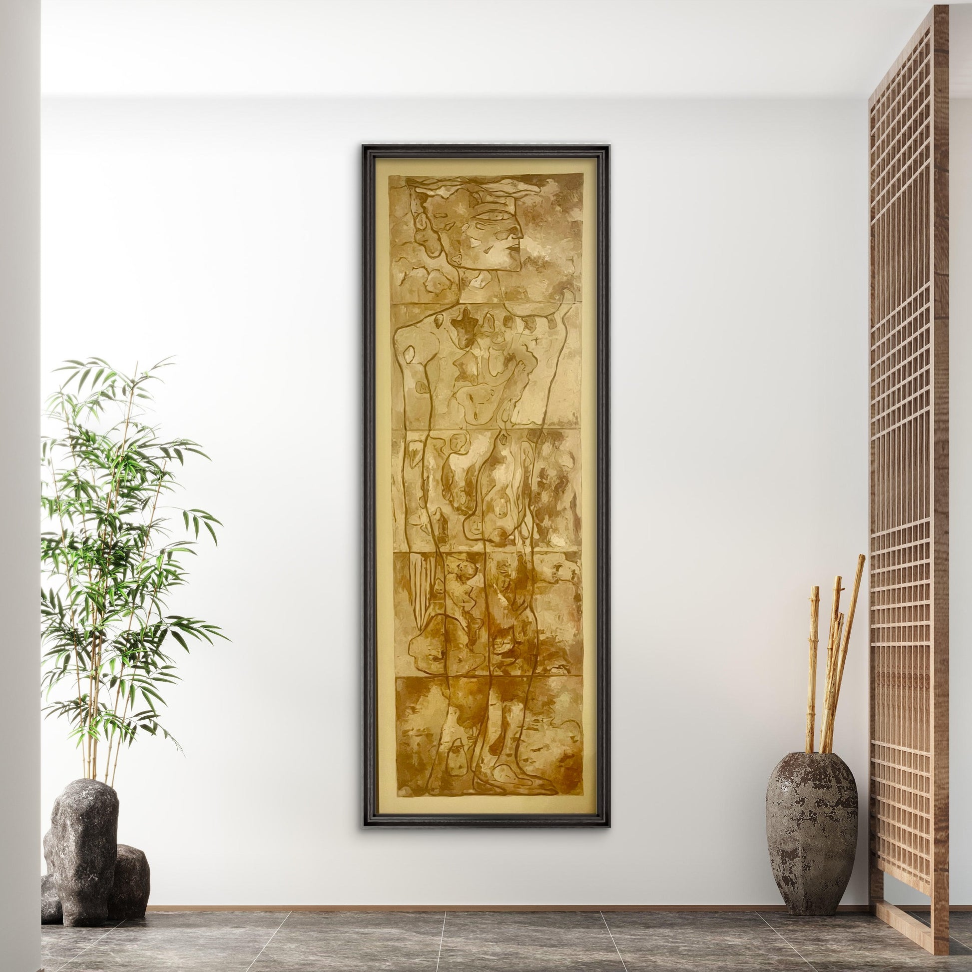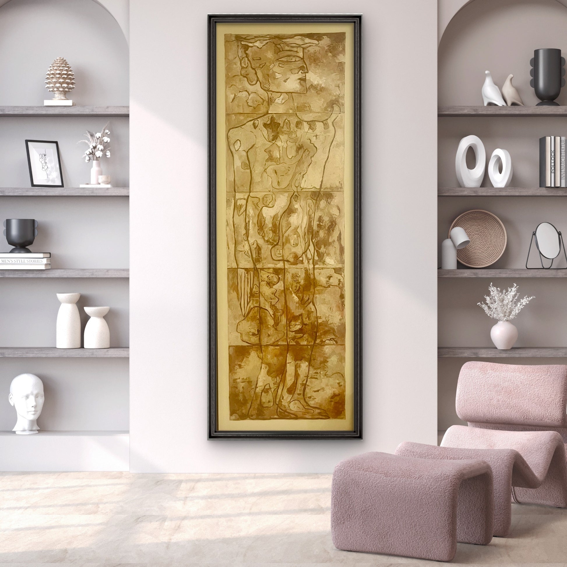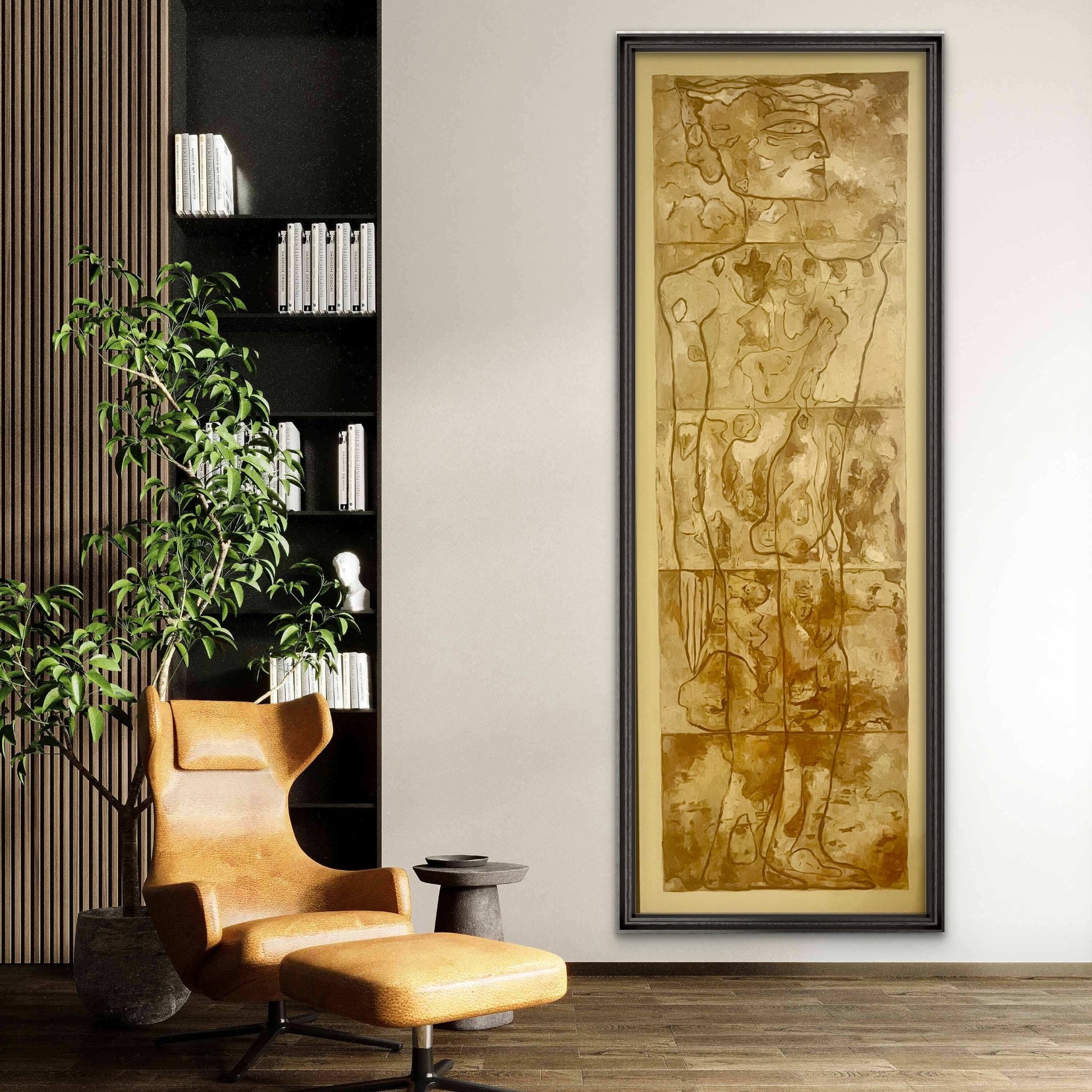 This striking two-piece contemporary collection captures the raw spirit of Baja California through bold, abstract composition. Rendered in warm, earthy pigments that echo the peninsula's desert terrain, the paintings feature an elongated figure traversing the landscape alongside surrounding portraits representing the region's rich cultural tapestry. With subtle Egyptian undertones and textured surfaces that command attention, these large-format works function as powerful focal points in expansive interiors. The vertical orientation suits gallery-style presentation, while the sophisticated interplay of indigenous and modern aesthetics introduces both visual depth and meaningful cultural resonance to discerning collectors seeking statement art with narrative substance.
