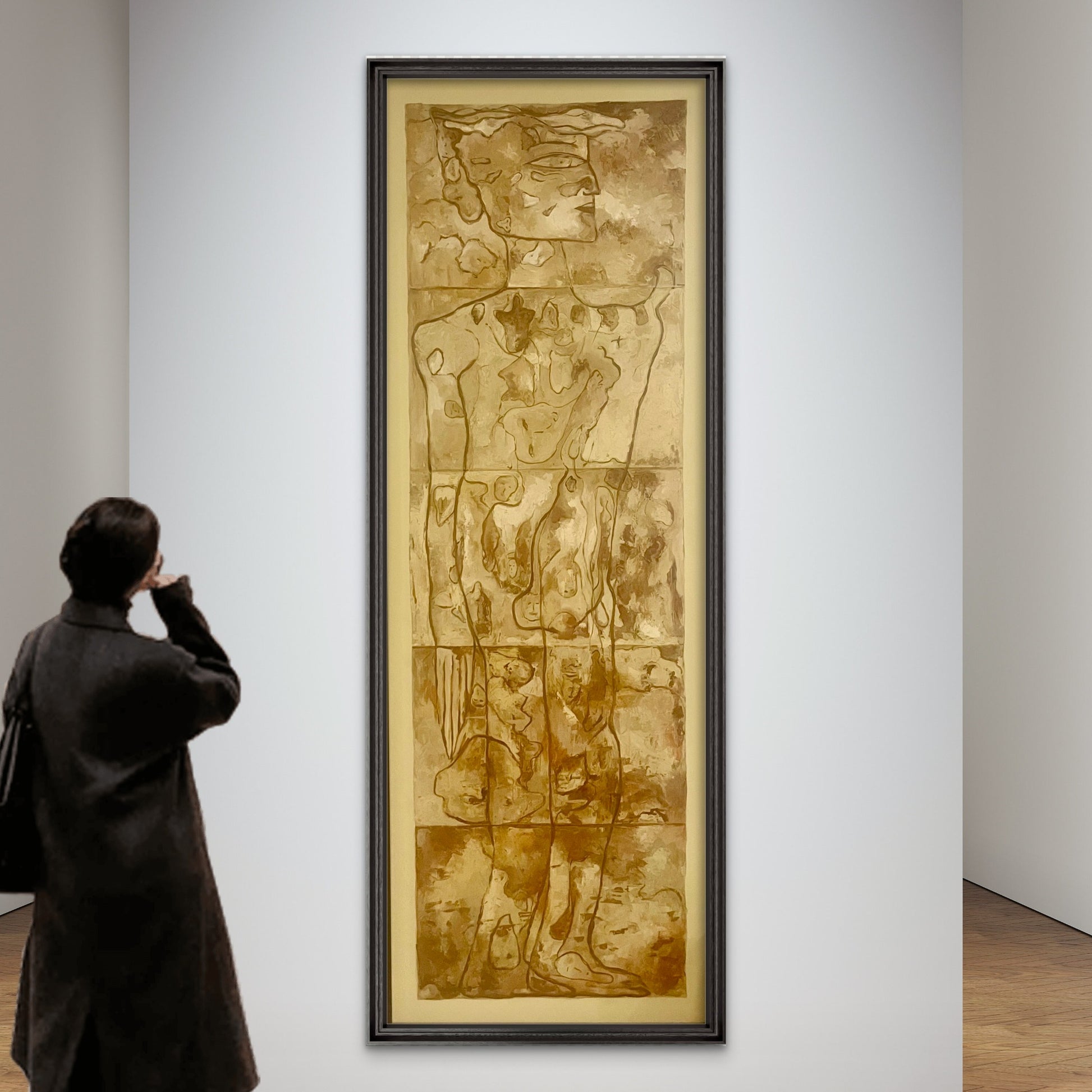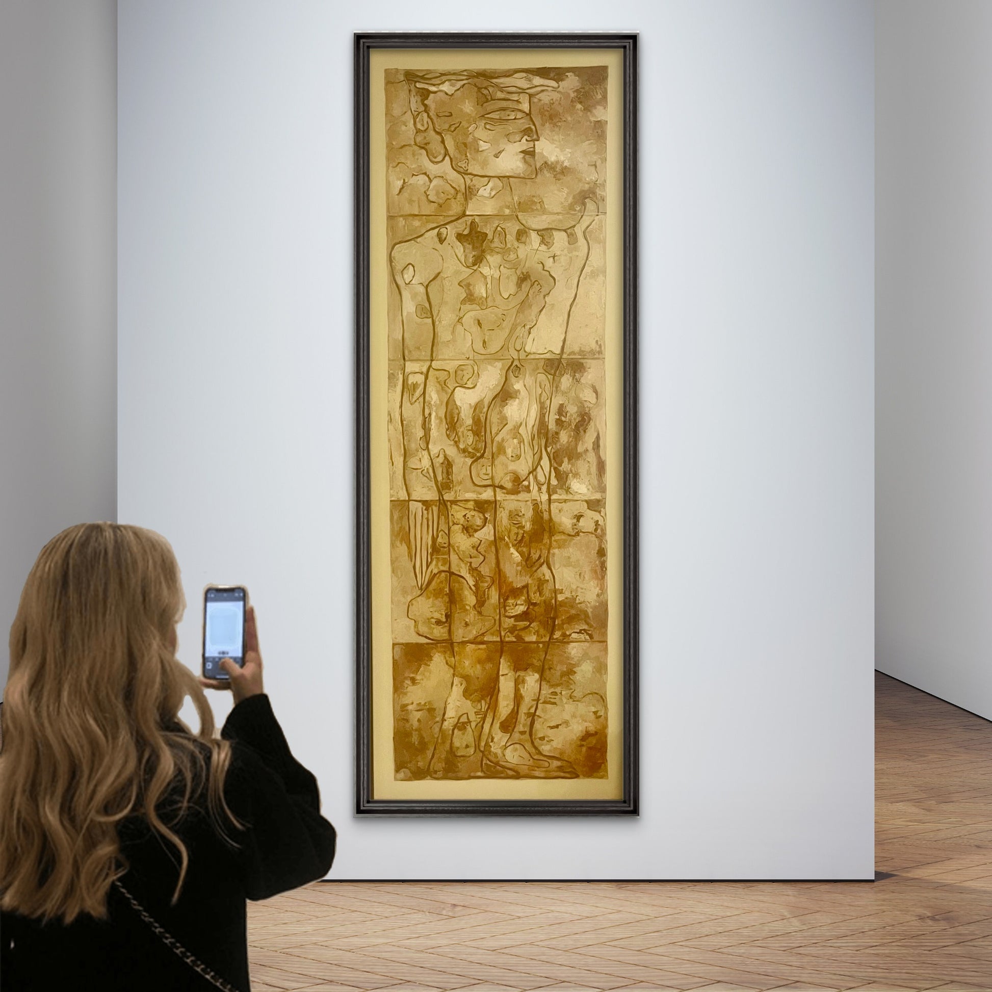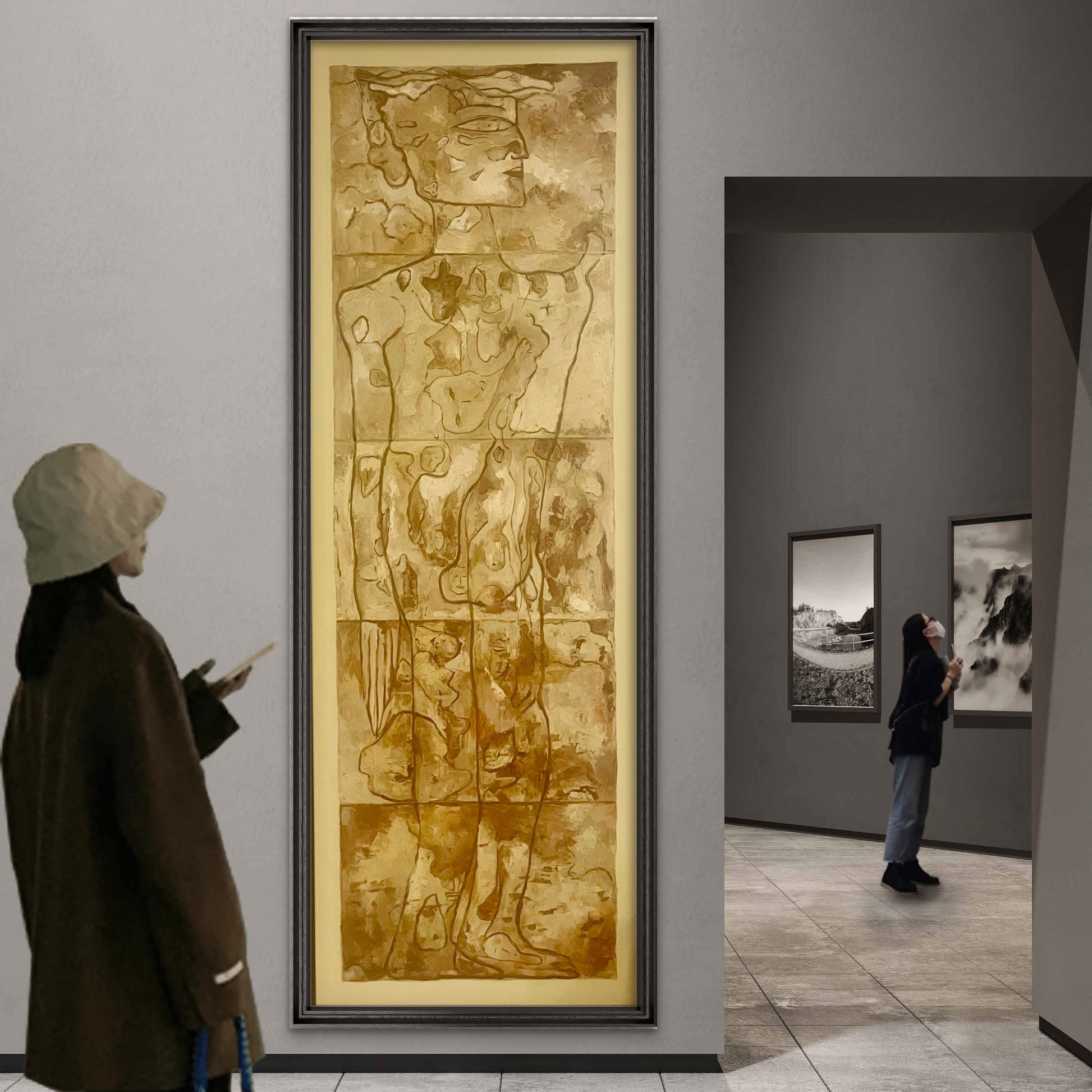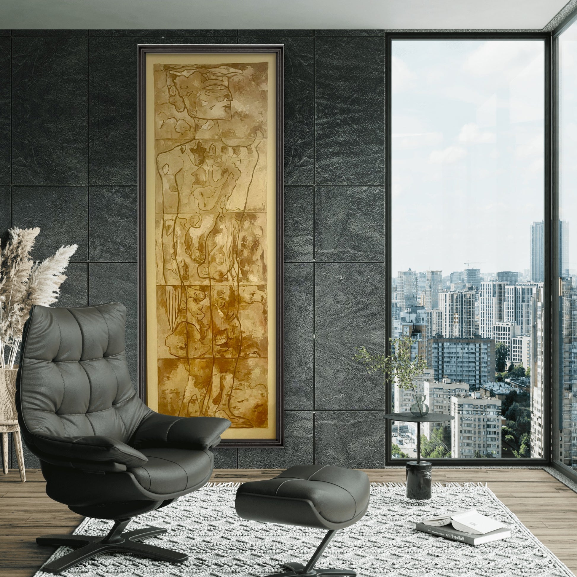 This striking two-piece contemporary collection captures the raw spirit of Baja California through bold, abstract composition. Rendered in warm, earthy pigments that echo the peninsula's desert terrain, the paintings feature an elongated figure traversing the landscape alongside surrounding portraits representing the region's rich cultural tapestry. With subtle Egyptian undertones and textured surfaces that command attention, these large-format works function as powerful focal points in expansive interiors. The vertical orientation suits gallery-style presentation, while the sophisticated interplay of indigenous and modern aesthetics introduces both visual depth and meaningful cultural resonance to discerning collectors seeking statement art with narrative substance.