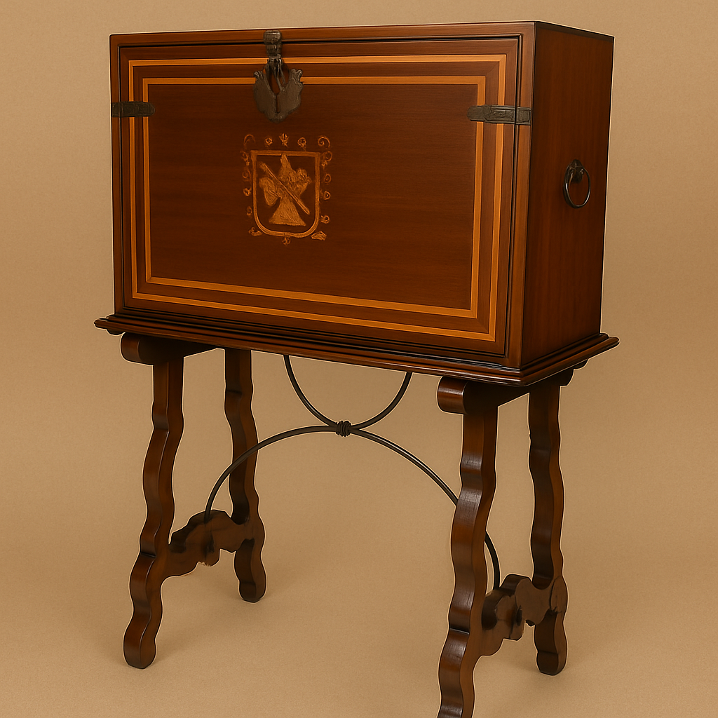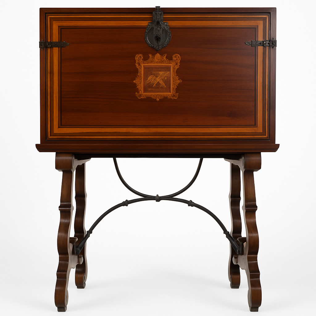 Originally crafted for the iconic One&Only Palmilla resort, this exceptional cantina bar is a masterpiece by the celebrated artisans of Ebanista. Designed with the elegance of a vintage travel trunk, it features exquisite wood inlays, a carved front crest, and a lid that gracefully folds down to create a functional serving table.